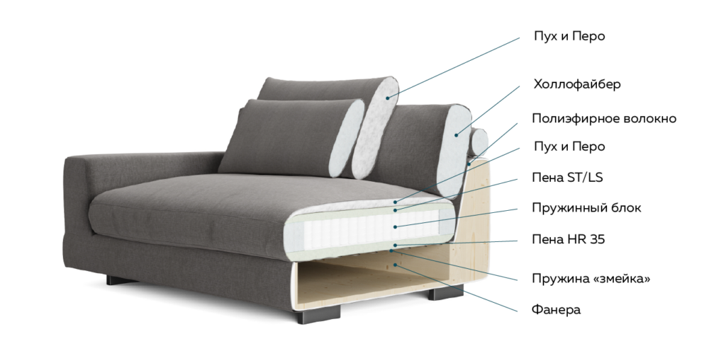 Каркас изготовлен из массива березы. В качестве наполнителей используются высококачественный пенополиуретан различной плотности с двумя видами пружин и стерилизованное утиное перо в специальном тиковом чехле.